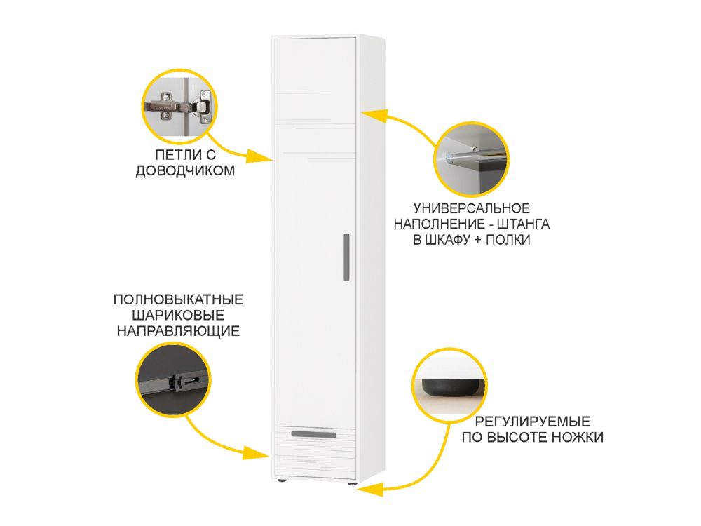 Шкаф-пенал «Аляска 501.22» является частью модульной программы «Аляска». Актуальное сочетание белого с глубоким темно-серым цветом и лаконичный графический рисунок – отличительная особенность этой коллекции. Шкаф-пенал можно использовать не только в сочетании с другими модулями подростковой, но и как отдельный предмет мебели.