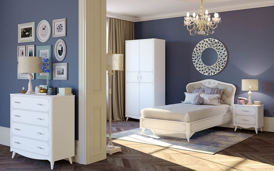 - Девичий дизайн мебели подчеркивают фигурный нижний горизонт в сочетании с изящными невысокими ножками и округлые профили по бокам каждого модуля.