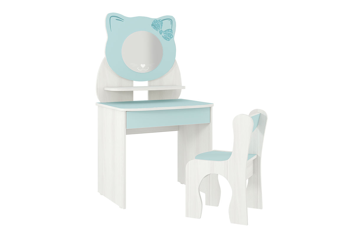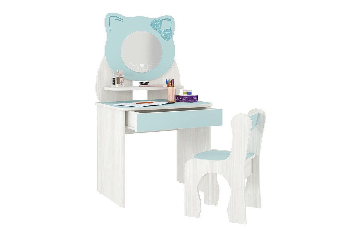 Состоит из: стула и стола с зеркалом, полками и выдвижным ящиком. Изделие симметричное.