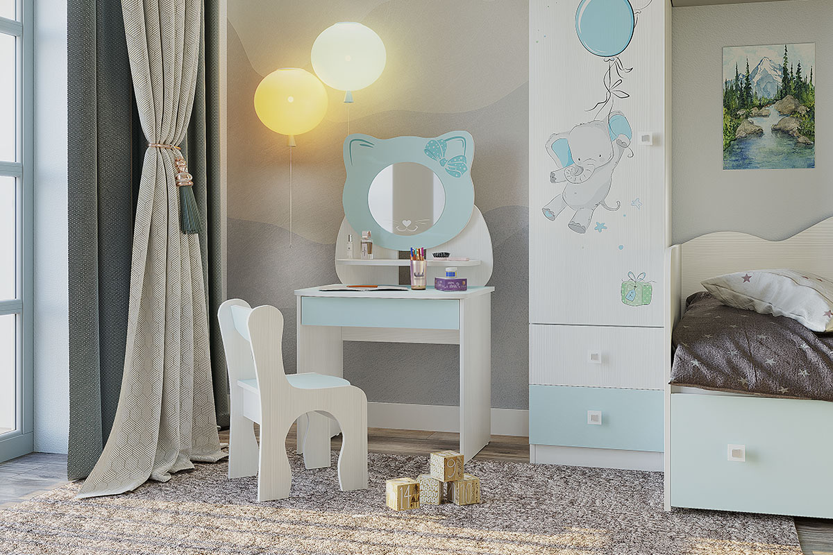 Девочки любят во всем подражать маме. Отличным подарком для Вашей дочки будет комплект-трюмо с зеркалом, полочками, выдвижным ящиком и замечательным стульчиком в едином стиле.