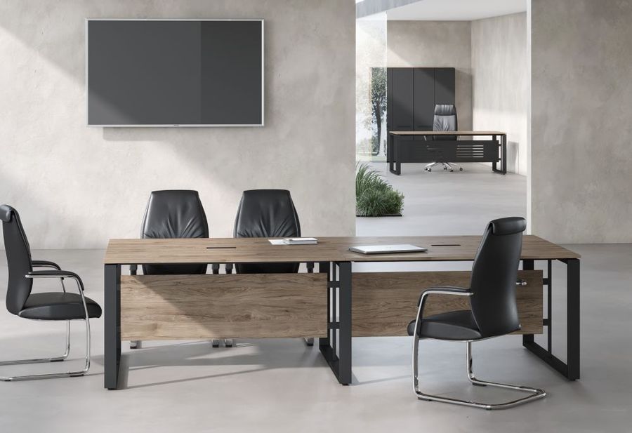Кабинет ENIO это дизайн, вдохновленный итальянскими трендами и адаптированный под российские стандарты. Он воплощает в себе современные идеи открытости и легкости, но при этом учитывает потребности и предпочтения российских руководителей. Серию отличает выразительный контраст деталей массивность металлических опор дополнена парящими деревянными столешницами и фронтальными панелями. А строгость и лаконичность крупных деталей антрацитового цвета разбавлена богатством древесного декора. Именно эта тонкая игра нюансов делает кабинет ENIO таким особенным. Опоры столов O-образной формы с сечением трубы 70х30 мм популярное решение в современной офисной мебели. В ENIO опоры дополнены тонкими линиями ассиметрично расположенных траверс, что делает дизайн этого кабинета привлекательным для широкой публики, но при этом абсолютно незаурядным. Характеристики благородный оттенок пепельно-коричневой древесины с мягкой ажурной текстурой дерева глубокий темно-серый цвет антрацитового угля два варианта материала фронтальной панели металл перфорированный, толщина 1,5 мм, цвет Антрацит, ЛДСП 18 мм в цвет столешницы два варианта высоты фронтальной панели из ЛДСП высокая H646 мм и узкая h400 мм основной материал ЛДСП класс Е1, 18 мм защита торцов изделий из ЛДСП кромка ПВХ 2 мм 0,45 мм корпус шкафов и тумб опоры столов О-образной формы из профиля трубы 70х30 мм, толщина металла 1,5 мм, цвет Антрацит, регулировка по высоте. Две траверсы металлические из профиля трубы 40х25 мм, толщина металла 2 мм упаковка пятислойный гофрокартон, пенопласт лицевая фурнитура металлические ручки черного цвета, кабель-менеджмент гарантийный срок 3 года.Условия покупки