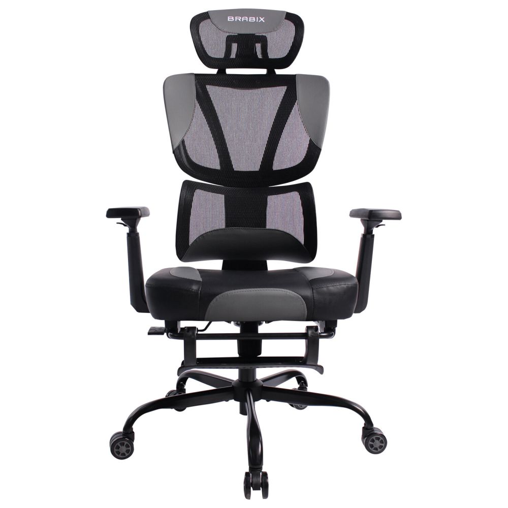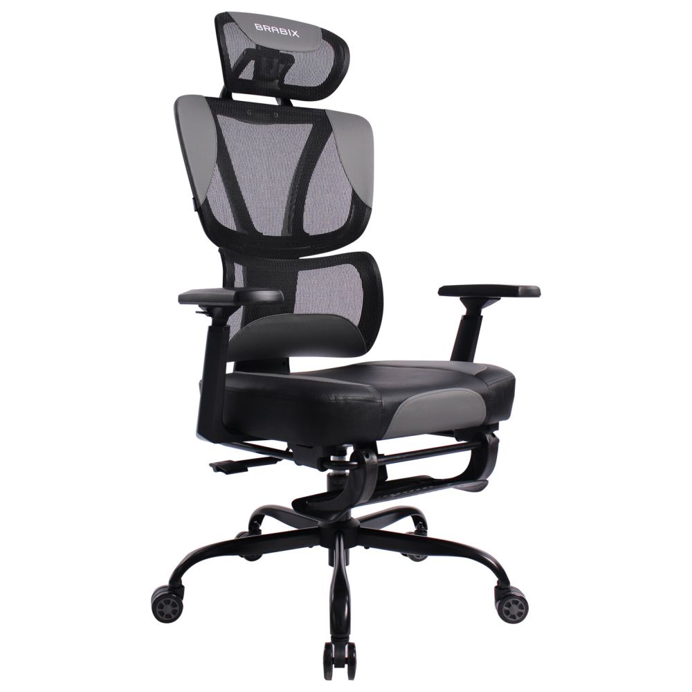 Описание Кресло BRABIX PEMIUM "Venom GM-530" создано с учётом строгих требований к эргономике и функциональности. Благодаря откидывающейся подставке для ног вы можете организовать себе комфортный перерыв в любое время. Кресло выполнено из материалов высокого качества. Обивка спинки и подголовника из качественной экокожи и сверхпрочной сетки, поэтому легко чистится и долго сохраняет привлекательный внешний вид. Обивка сиденья выполнена из экокожи, что делает сиденье приятным на ощупь и устойчивым к износу. Эргономичный дизайн разработан с заботой о вашем здоровье. Регулируемые подголовник и поясничная поддержка обеспечат оптимальное положение корпуса, способствуя снижению напряжения в области шеи и спины. Синхронный механизм качания максимально разгружает позвоночник за счет синхронного движения спинки и сиденья, может зафиксировать спинку в трех положениях, заблокировать или активировать качание и отрегулировать его силу под вес пользователя. Эта система считается наиболее технически совершенной и самой эргономичной. Синхромеханизм решает сразу несколько основных эргономических задач по обеспечению комфорта и сохранению здоровья при длительной сидячей работе - позволяет пользователю кресла свободно менять положение тела - предотвращает нефизиологичные позы и движения при любом типе работы - обеспечивает постоянную поддержку спины - выполняет функцию качания. Регулируемые 3D пластиковые подлокотники позволят с удобством разместиться в кресле, а чтобы полностью расслабиться, достаточно откинуть подставку для ног и принять удобное положение. В основании надежное металлическое пятилучие и газлифт 3 класса. Максимальная нагрузка 130 кг. Покупайте кресла BRABIX PREMIUM и наслаждайтесь комфортом, высоким качеством и эргономикойУсловия покупки