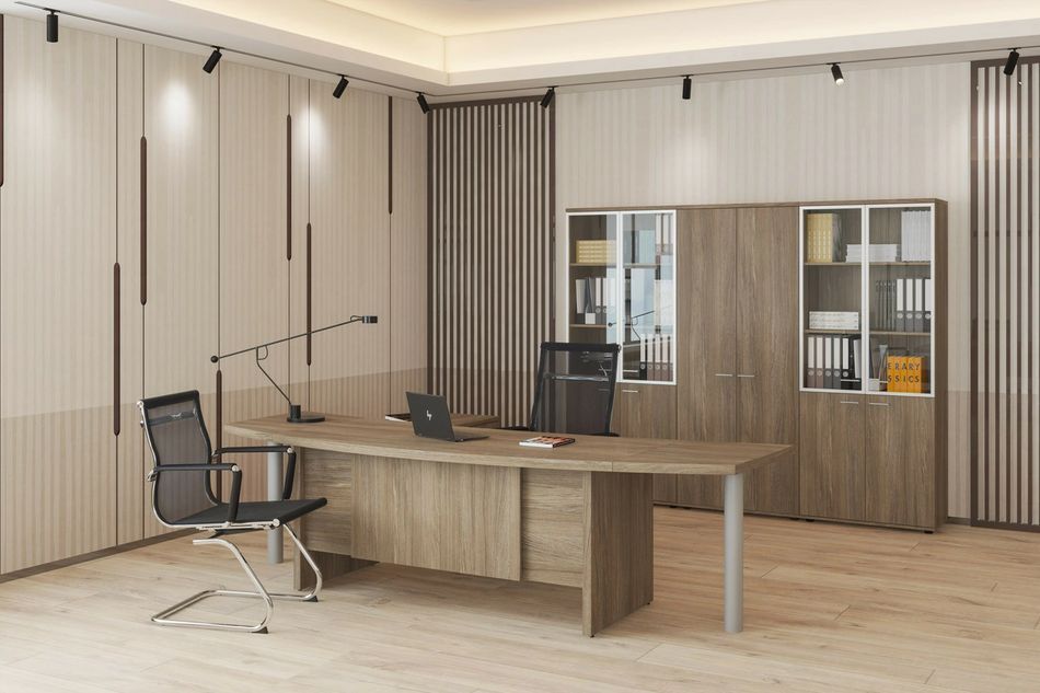 Кабинет WING это символичное сочетание традиционных материалов для изготовления мебели с уникальными нелинейными формами столешницы кабинет. Кабинет для руководителей WING отражает современные взгляды на офисную мебель. Оригинальный дизайн кабинета подчеркивается уникальной формой столешницы, которая тяготеет к форме крыла. Это не только исключительная особенность дизайна, но и её функциональная составляющая, обеспечивающая присоединение дополнительных рабочих поверхностей в виде боковых приставок нелинейной формы, а также традиционного брифинга. Вся мебель выполнена в аутентичных древесных декорах, которые приближают дизайн кабинета к классическому, и декларируют в сознание владельца обещание надежности. Центральным элементом коллекции является стол руководителя, который благодаря своему вневременному дизайну создает стилистически гармоничное сочетание с остальными элементами коллекции. Дизайн стола подчеркивается уникальной формой столешницы и двумя передними панелями, направление текстуры которых расположено относительно друг друга под углом 90 градусов. Столешница и опоры изготовлены из ЛДСП толщиной 41 мм, полученной путем склеивания плиты толщиной 16 и 25 мм. Общиепараметры столешница из ЛДСП 41 мм 25+16 криволинейной формы, облицована кромкой ПВХ 2 мм по периметру опоры из ЛДСП 41 мм 25+16 облицованы кромкой ПВХ 2 мм по вертикальным торцам передняя панель комбинированная из ЛДСП 16 мм видимые вертикальные торцы накладки облицованы кромкой ПВХ 2 мм стол имеет регулируемые опоры. Столможетвыступатьвпространствекабинетакаксоло,такивсочетании сдругимиэлементамиколлекции,меняющимистилькабинетаиегообраз приставками боковыми брифингприставками опорными и мобильными тумбами.Условия покупки