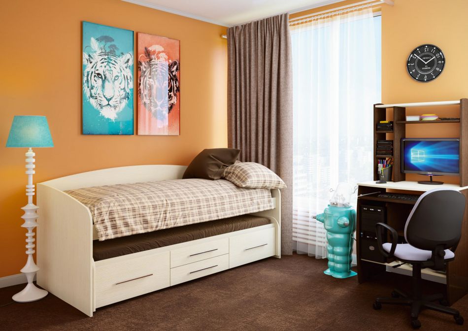 - Двухъярусная кровать имеет необычную компоновку. У неё выдвижное нижнее спальное место, благодаря чему общая высота кровати составляет всего 66 см.