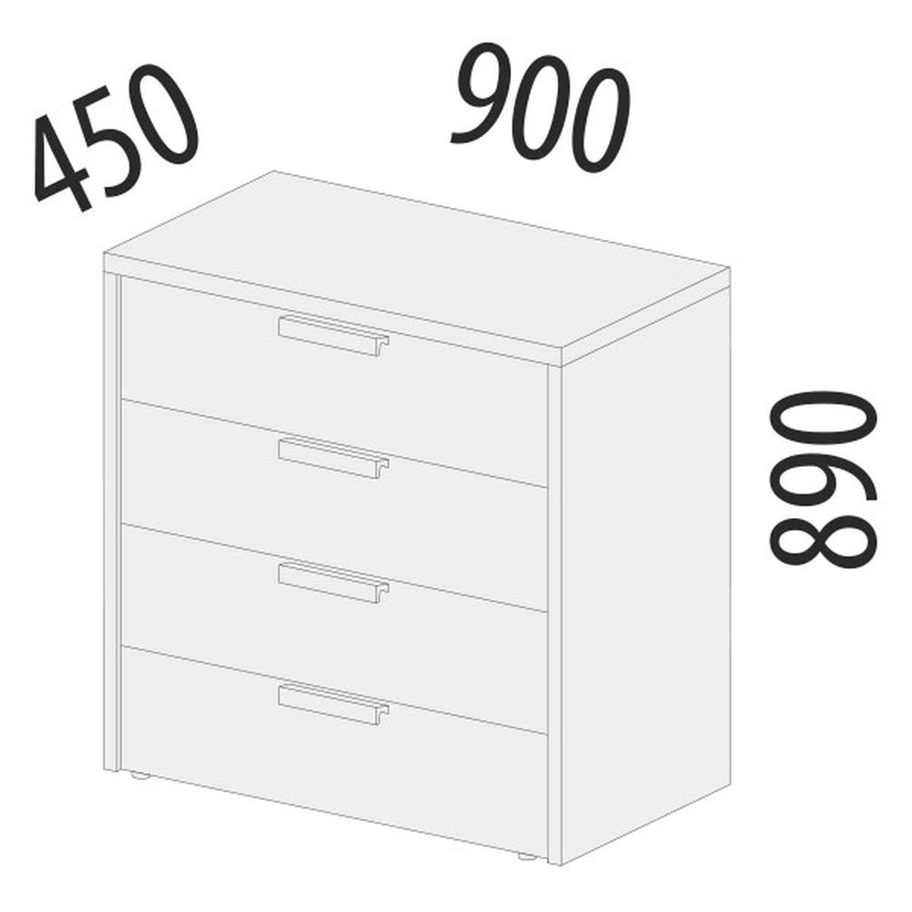 Комод «Кашемир 900.18» является частью модульной программы «Кашемир». В комоде установлены четыре выдвижных ящика. Шариковые направляющие полного выдвижения обеспечивают длительный срок эксплуатации изделия. Фасад верхнего ящика декорирован вставкой, точно передающей фактуру натурального дерева: как на ощупь, так и визуально. Ножки модуля регулируются по высоте, что позволяет при установке комода компенсировать возможные неровности пола. Рекомендуется крепление модуля к стене (крепежный уголок в комплекте).