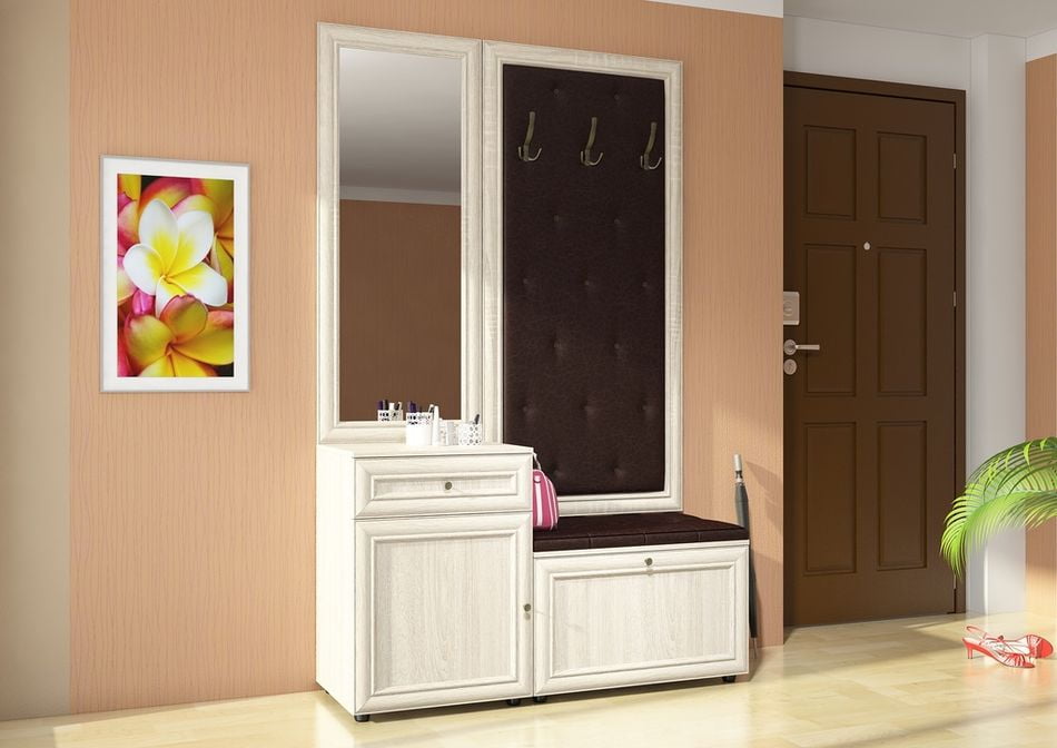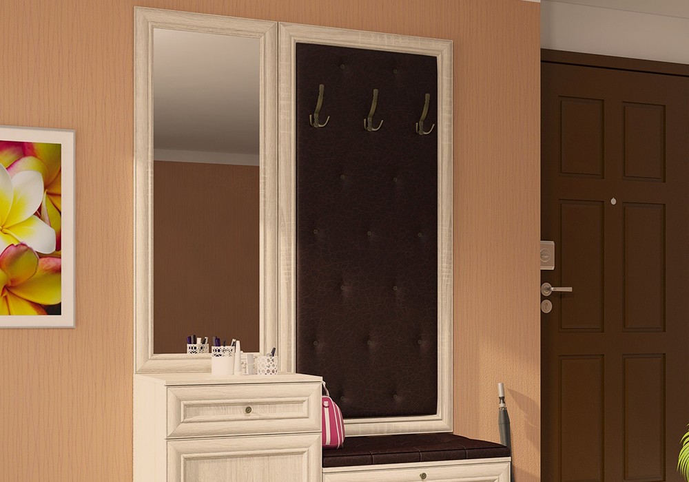 Основные материалы Корпус - ЛДСП Сонома светлая толщина 16 мм Фасад МДФ профиль Сонома светлая в сочетании с МДФ вставками Сонома светлая толщина 22 мм, МДФ накладка Сонома светлая для зеркала Задние стенки и дно ящиков ЛДВП Дуб молочный толщина 3 мм Торцы деталей обработаны кромкой ПВХ толщиной 0,4 мм в цвет ЛДСП Пуфик и вешалка экокожа Kordeliya черно-коричневая Аттика 09, наполнение поролон Зеркало цвет серебро толщина 4 мм Лицевая фурнитура Ручки кнопка круглая, цвет состаренная бронза, диаметр 24 мм, высота 22 мм, материал металл Опоры ножка круглая, цвет черный, диаметр 48 мм, высота 30 мм, материал пластик Крючки трёхрожковые, материал металл.Условия покупки
