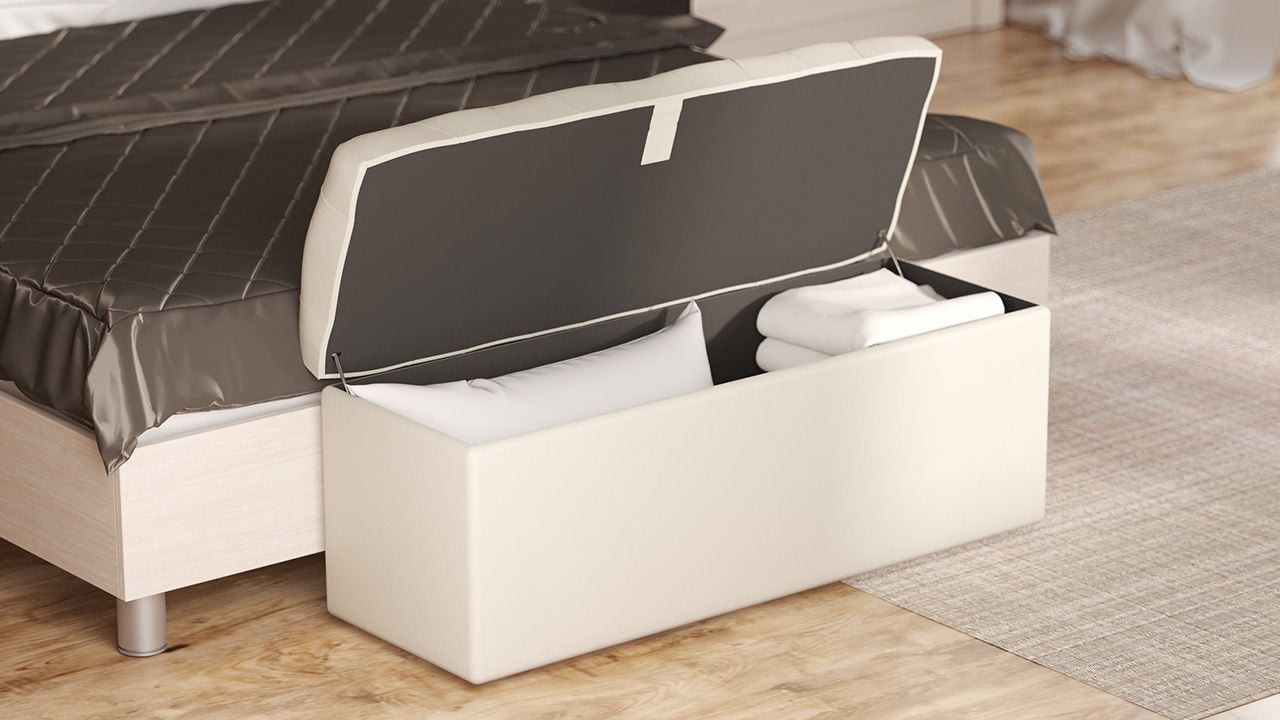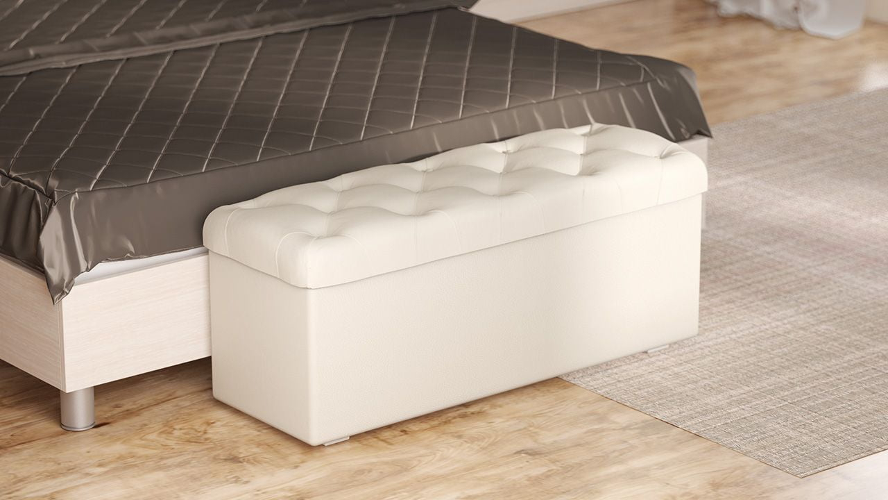 Такой пуфик станет отличным дополнением для мебельного гарнитура, использованного в оформлении спальни, и найдет своe; место у трюмо или туалетного столика. Этот функциональный аксессуар, выполненный из экокожи, будет прекрасно сочетаться с остальными предметами мебели и привнесe;т в интерьер комфортабельность и уют. Главная особенность этой модели - ящик, расположенный под сиденьем.