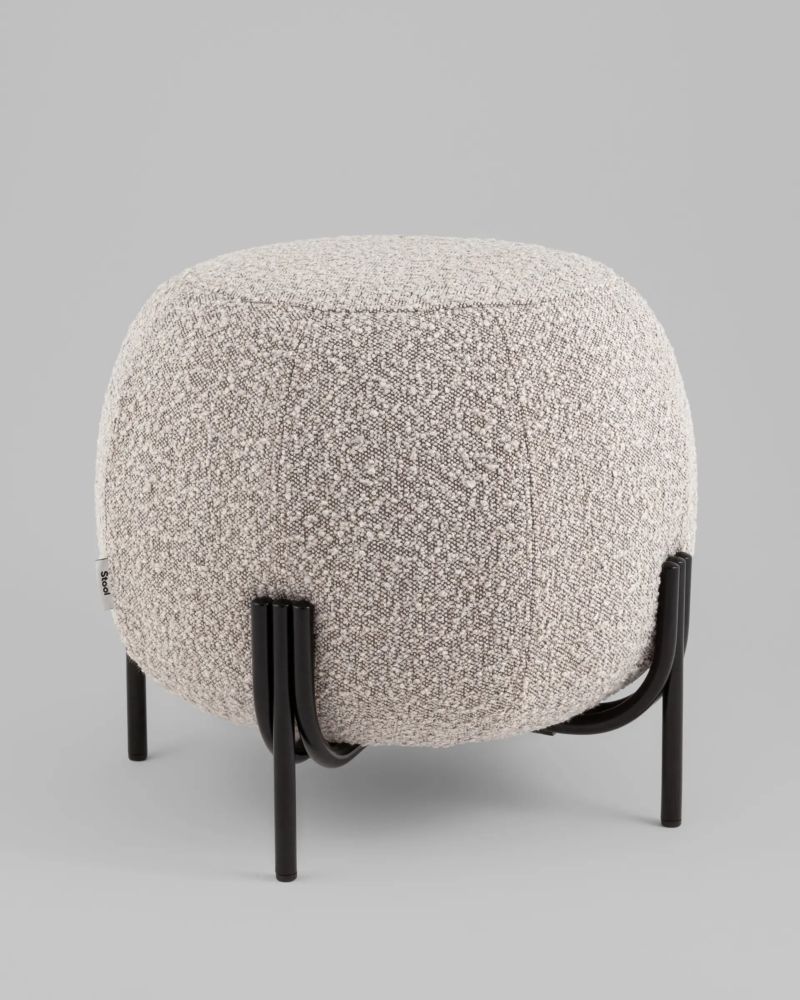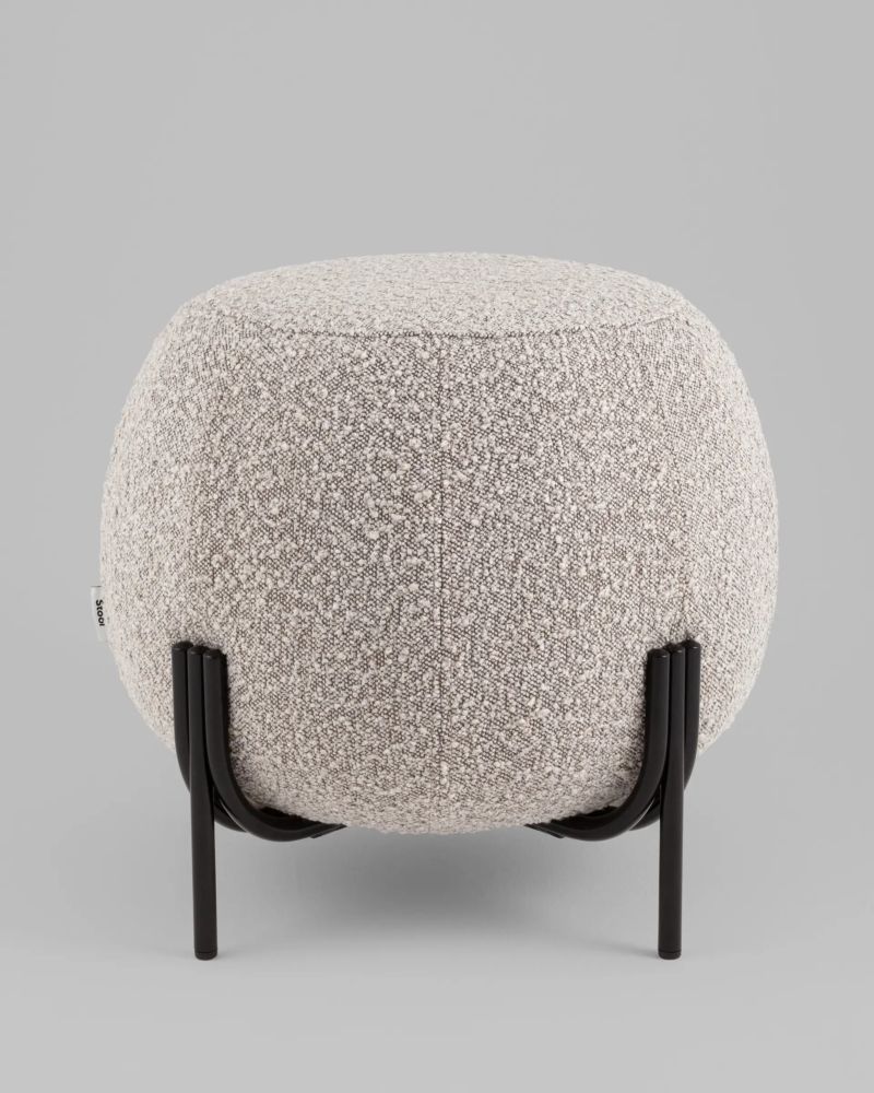 Пуф Флик New уютный акцент для современного интерьера. Материалы и цвета.Пуф обтянут мягкой и приятной на ощупь тканью букле серо-бежевого цвета, которая придает изделию уют и современную элегантность. Черный металлический каркас обеспечивает устойчивость и дополняет стильный дизайн. Дизайн.Круглая форма пуфа создает комфортное место для сидения или отдыха. Металлические ножки с изящной формой подчеркивают оригинальность модели и добавляют легкости конструкции. Функциональность.Пуф выдерживает нагрузку до 80 кг, что делает его удобным и надежным аксессуаром для дома. Место использования.Этот пуф станет идеальным дополнением для гостиной, спальни или лаунж-зоны, добавляя стиль и практичность в интерьер.Условия покупки