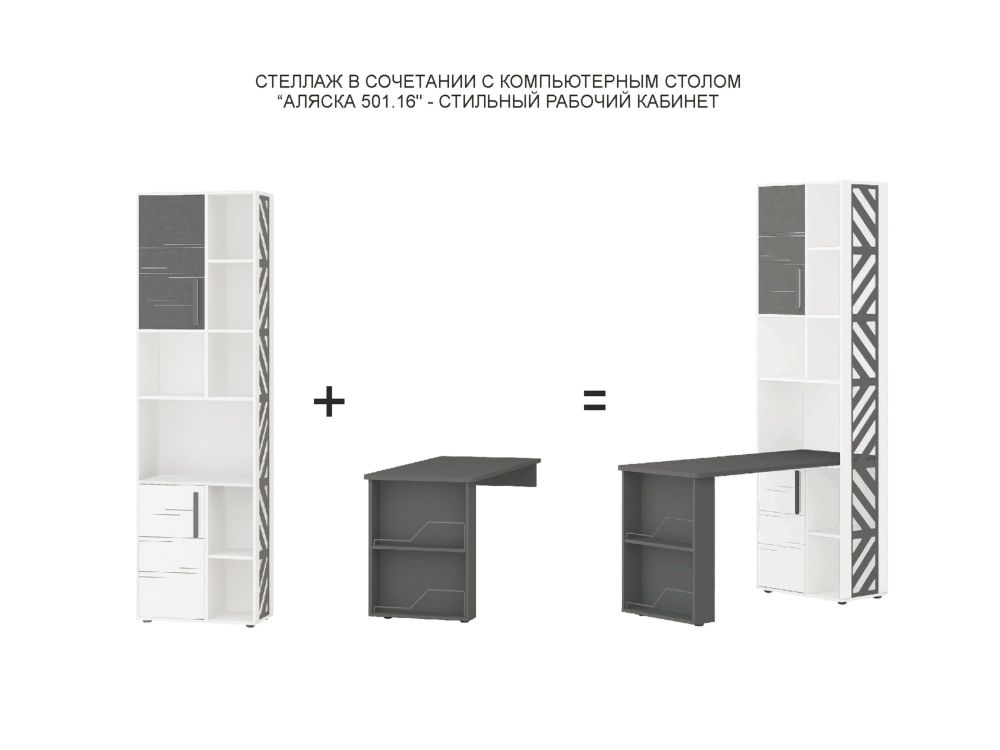 Стеллаж «Аляска 501.33» является частью модульной программы «Аляска». Модуль состоит из открытых и закрытых полок и является удачным решением для организации хранения книг, документов и других полезных мелочей. Для создания стильного и функционального рабочего пространства наши дизайнеры рекомендуют использовать этот стеллаж в сочетании с компьютерным столом «Аляска 501.16». В результате Вы получите полноценное рабочее место для дома, габаритные размеры которого позволят удобно его разместить даже в комнате небольшого размера.