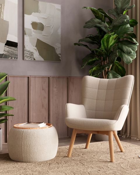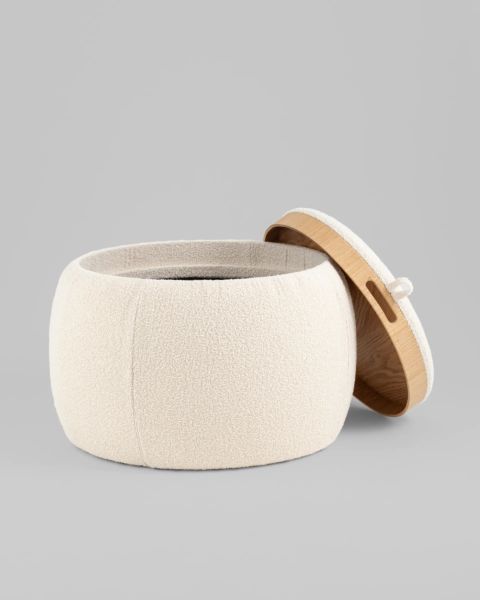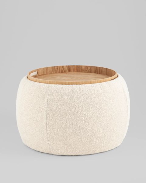 Мягкий пуф с ящиком станет незаменимым украшением интерьера. Он не только удобный, но и функциональный. Благодаря двухсторонней крышке, пуф можно трансформировать в журнальный столик. Столешница выполнена из светлого дерева с бортиками по краям и вырезными ручками для удобства, и безопасности при использовании. Крышка пуфика полностью съемная и при необходимости её можно использовать как поднос. Компактный и вместительный, такой пуфик наполнит пространство особым уютом и теплом. Подойдет для любого интерьера - как в классическом стиле, так и в современном. Мягкая обивка выполнена из букле в бежевом цвете. Прочный каркас из фанеры не утяжеляет изделие и выдерживает нагрузку до 150 кг. Небольшие подпятники в основании пуфа защищают напольные покрытия от царапин и предотвращают скольжение. Высота пуфа 36 см. Диаметр 56 см.Условия покупки