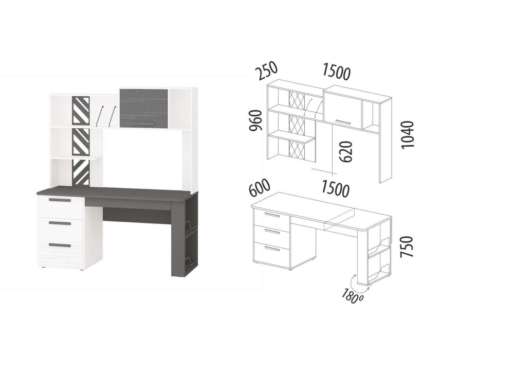 Стол с надстройкой «Аляска 63» включает письменный стол «Аляска 501.24» и надстройку «Аляска 501.25». Модель выполнена в современном стиле – в актуальном сочетании белого с глубоким темно-серым цветом. Корпус стола, фасады ящиков, надстройка выполнены из ЛДСП повышенной прочности.