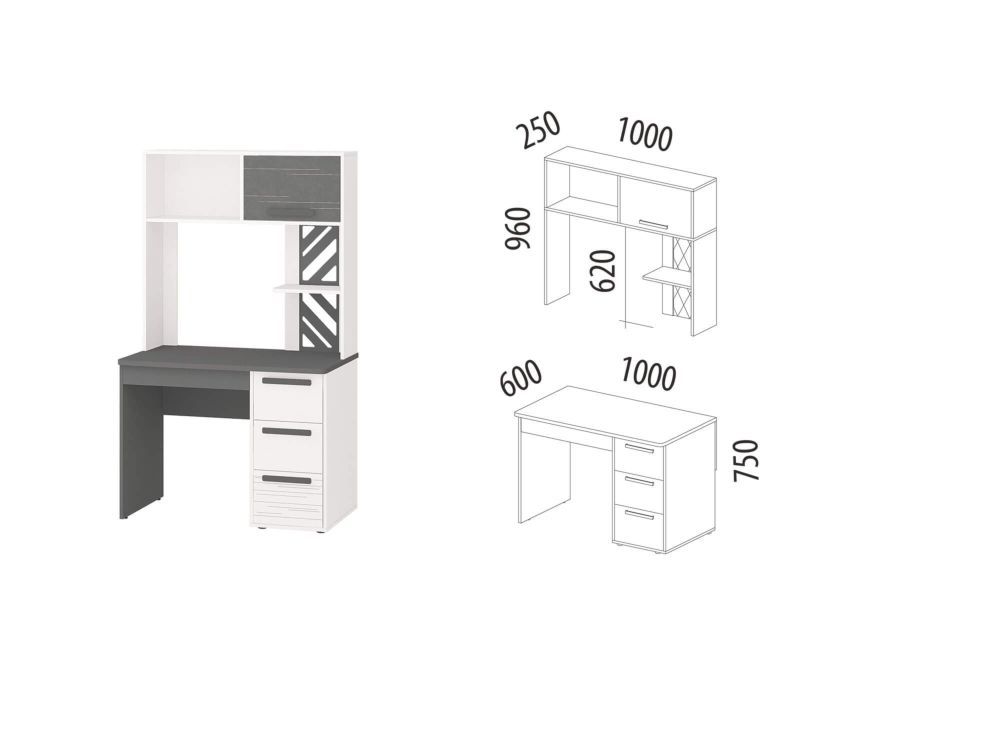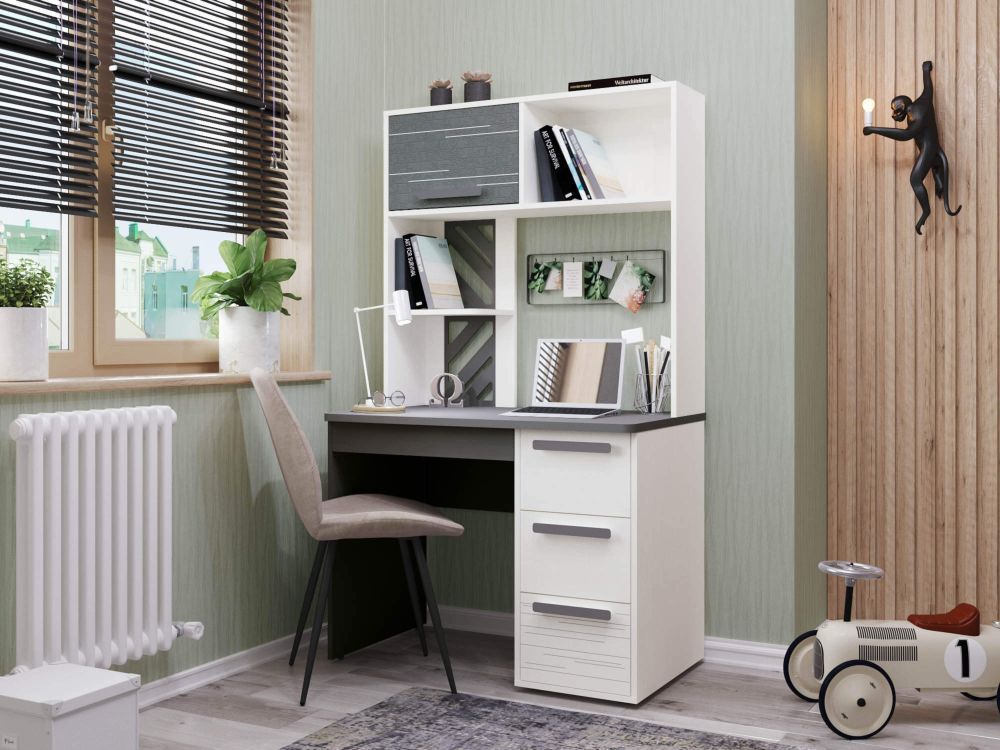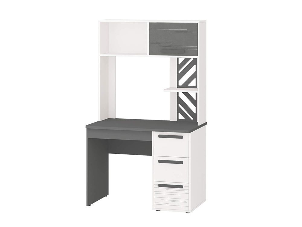 Стол с надстройкой «Аляска 60» включает письменный стол «Аляска 501.26» и надстройку «Аляска 501.20». Модель выполнена в современном стиле – в актуальном сочетании белого с глубоким темно-серым цветом. Корпус стола, фасады ящиков, надстройка выполнены из ЛДСП повышенной прочности.