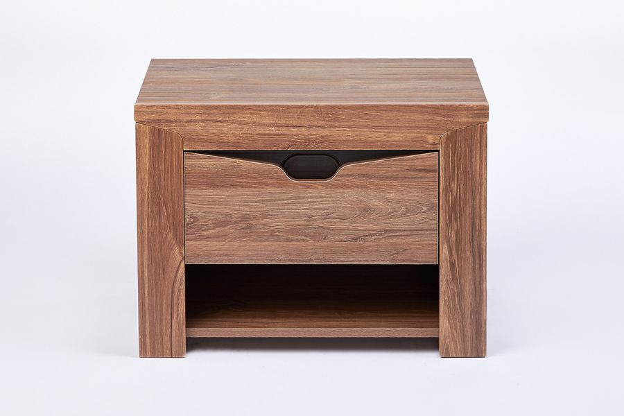 Прикроватная тумба Сорренто — мебель и функциональная, и стильная. Она выполнена в модном цвете натурального дуба, отлично сочетается с другой мебелью одноименной коллекции. Модель достаточно вместительная, в двух отделениях и на поверхности можно найти место множеству мелочей. Особый шарм изделия заключен в выдвижном ящике, верхняя часть которого имеет экстравагантный вырез и темную ручку. Эта тумбочка устойчива и не будет покачиваться от неосторожного движения, что особенно важно, если там стоит стакан с водой или хрупкие предметы. Серия мебели для спальни «Соренто» от мебельной фабрики «Мебельград» отвечает всем к мебели для дома и отличается ценовой экономичностью и широкой линейкой моделей. Модельный ряд серии «Соренто» позволяет организовать пространство с максимальным комфортом и практичностью. Дизайн строится на простоте линий, а модульные элементы позволяют создать композицию любой конфигурации и под разные размеры помещения.Модульная система «Соренто» - идеальное решение для тех, кто предпочитает современный минимализм в сочетании с классическими четкостью линий и качеством. Все элементы данной серии могут быть заказаны как вместе, так и по отдельности и комплектоваться при этом по вашему желанию. Коллекция дает огромный выбор по расположению и установке ее элементов в соответствии с индивидуальными вкусом и потребностями заказчика.