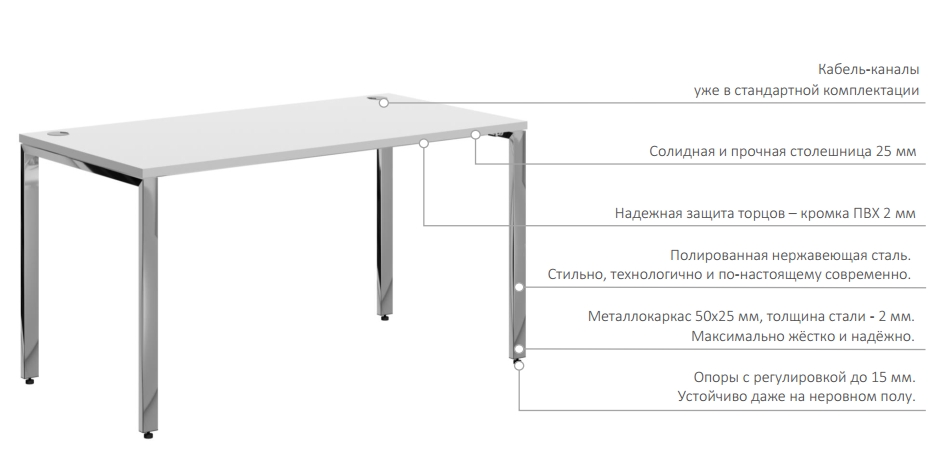 | Особенности | Столешница из лдсп толщиной 25 мм c кромкой пвх 2 мм. опоры металлокаркаса п-образной формы из полированной нержавеющей стали. труба 50х25х2 мм |
